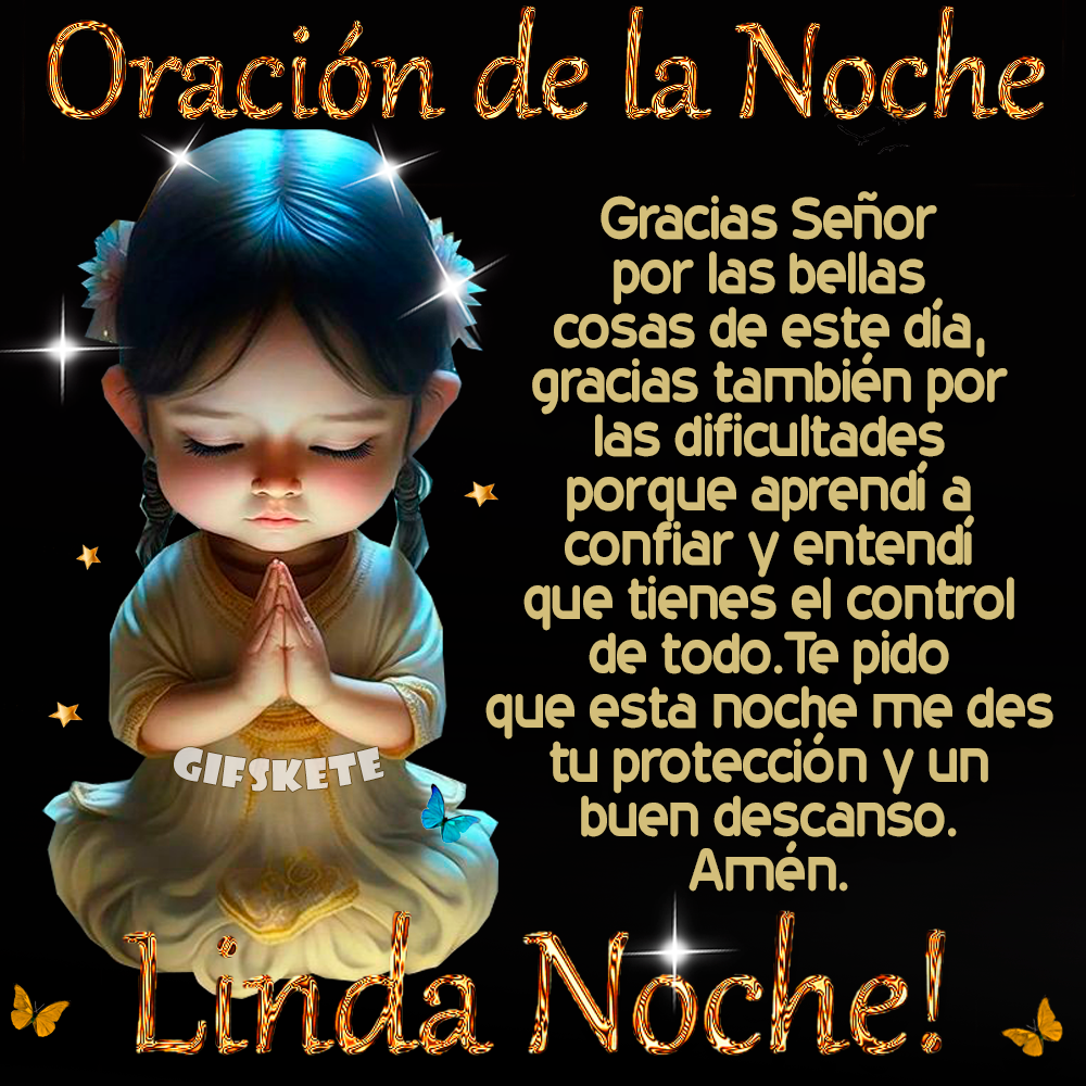 Padre en el nombre de tu hijo Jesús ,te doy gracias por esté día que esta terminando,donde me diste muchas bendiciones y alegrías al lado de mis seres queridos en esta noche Padre Todopoderoso te pido que cuides de mis sueños y el de todos mis amigos y familiares .